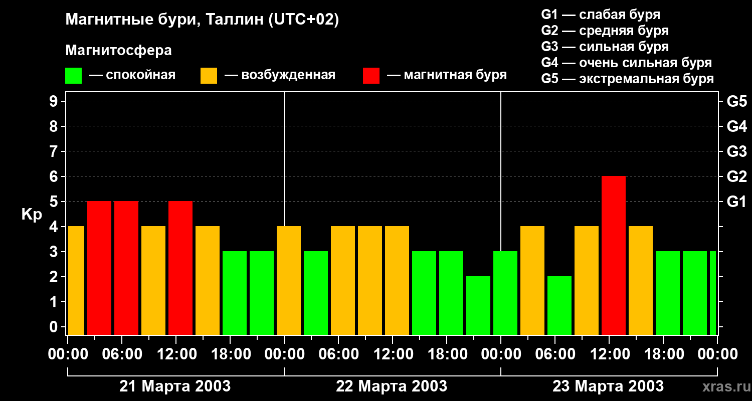 Изменения геомагнитного индекса Kp с 21 по 23 марта 2003 года для средних широт