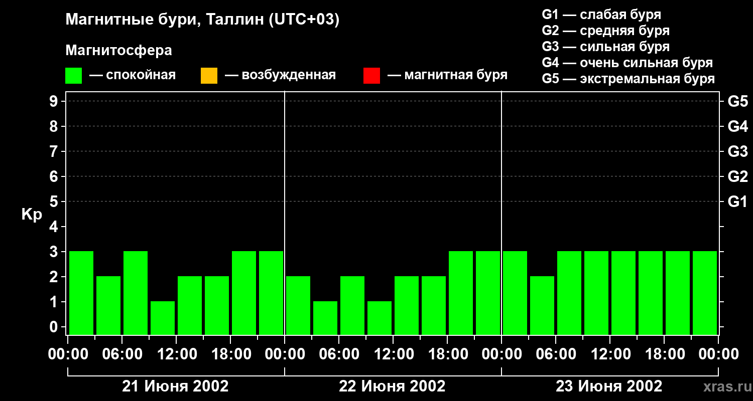 Изменения геомагнитного индекса Kp с 21 по 23 июня 2002 года для средних широт