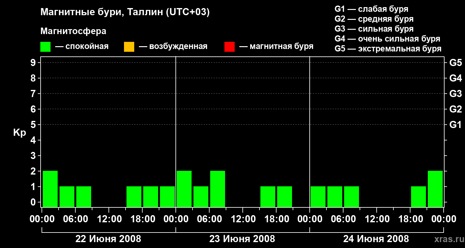 Изменения геомагнитного индекса Kp с 22 по 24 июня 2008 года для средних широт