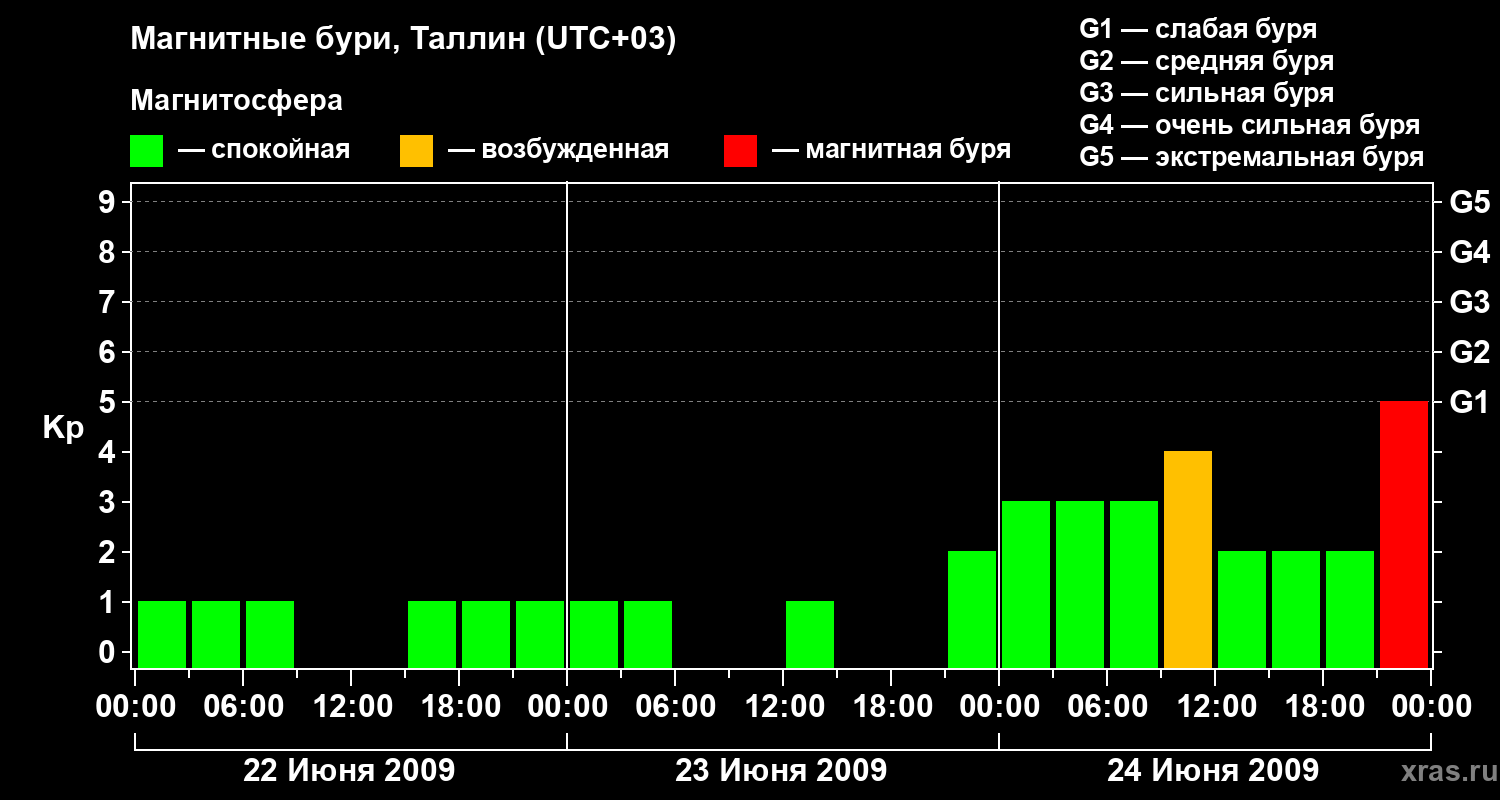 Изменения геомагнитного индекса Kp с 22 по 24 июня 2009 года для средних широт