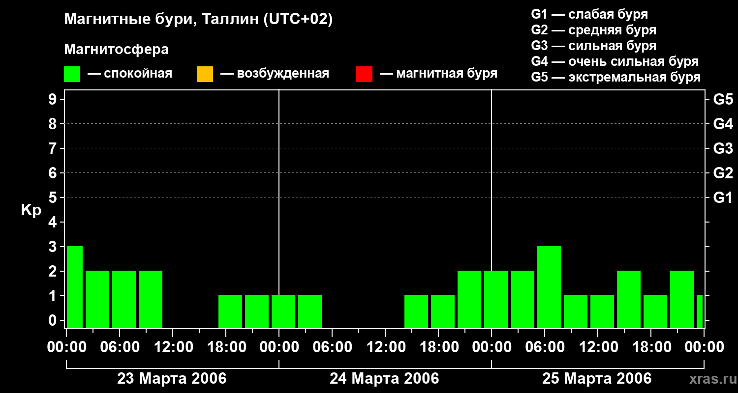 Изменения геомагнитного индекса Kp с 23 по 25 марта 2006 года для средних широт