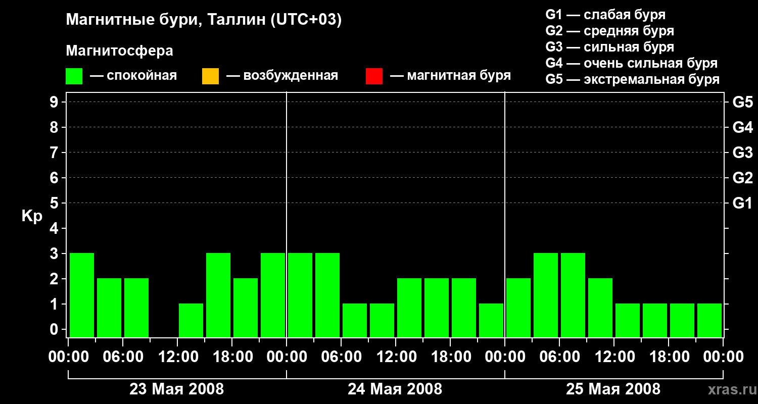 Изменения геомагнитного индекса Kp с 23 по 25 мая 2008 года для средних широт
