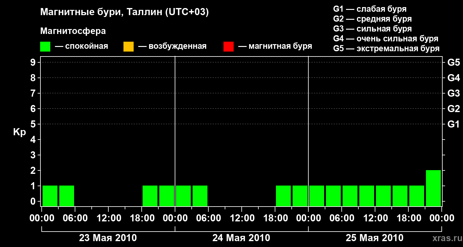 Изменения геомагнитного индекса Kp с 23 по 25 мая 2010 года для средних широт