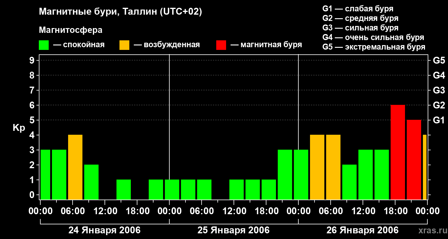 Изменения геомагнитного индекса Kp с 24 по 26 января 2006 года для средних широт