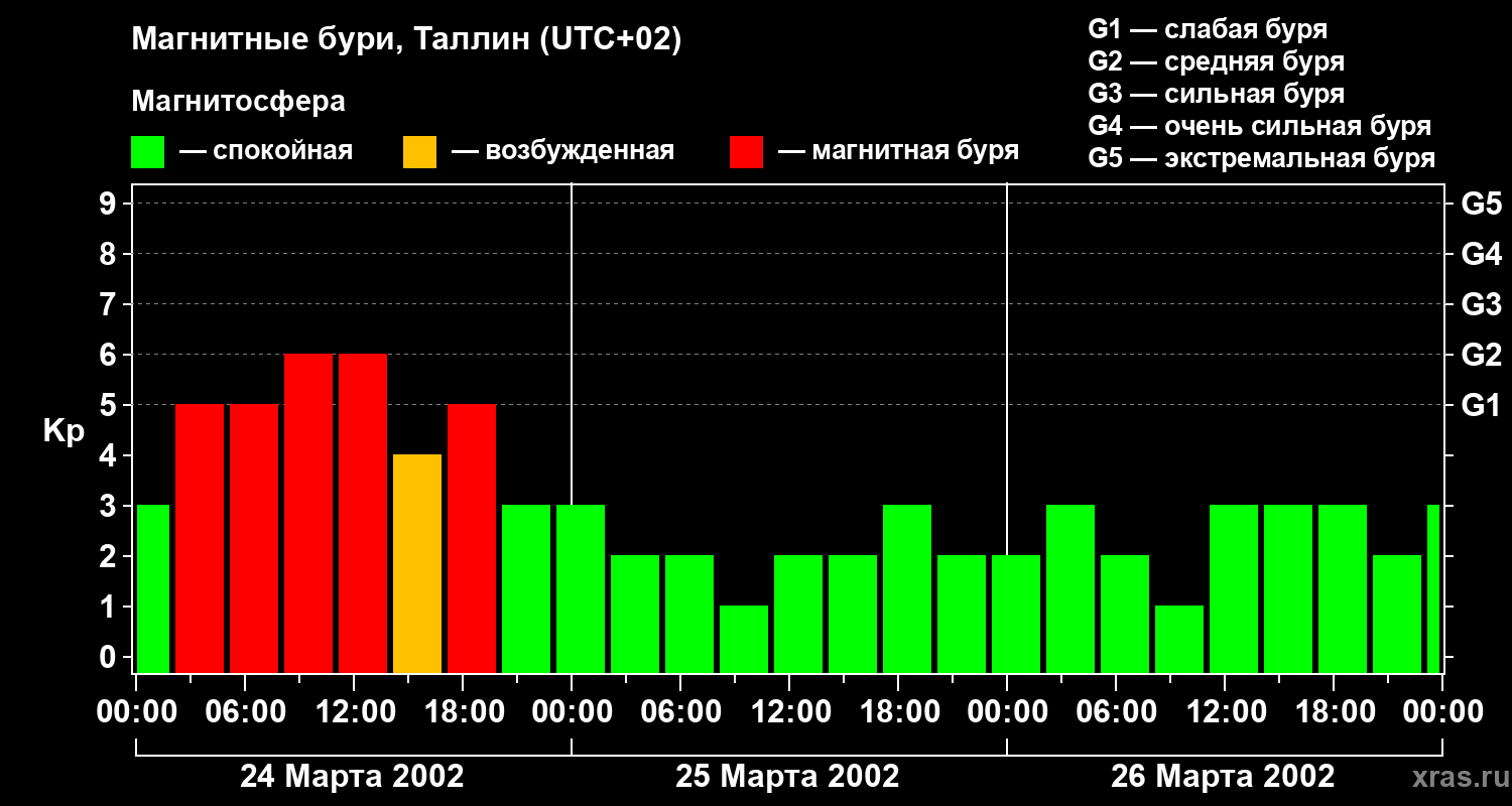 Изменения геомагнитного индекса Kp с 24 по 26 марта 2002 года для средних широт