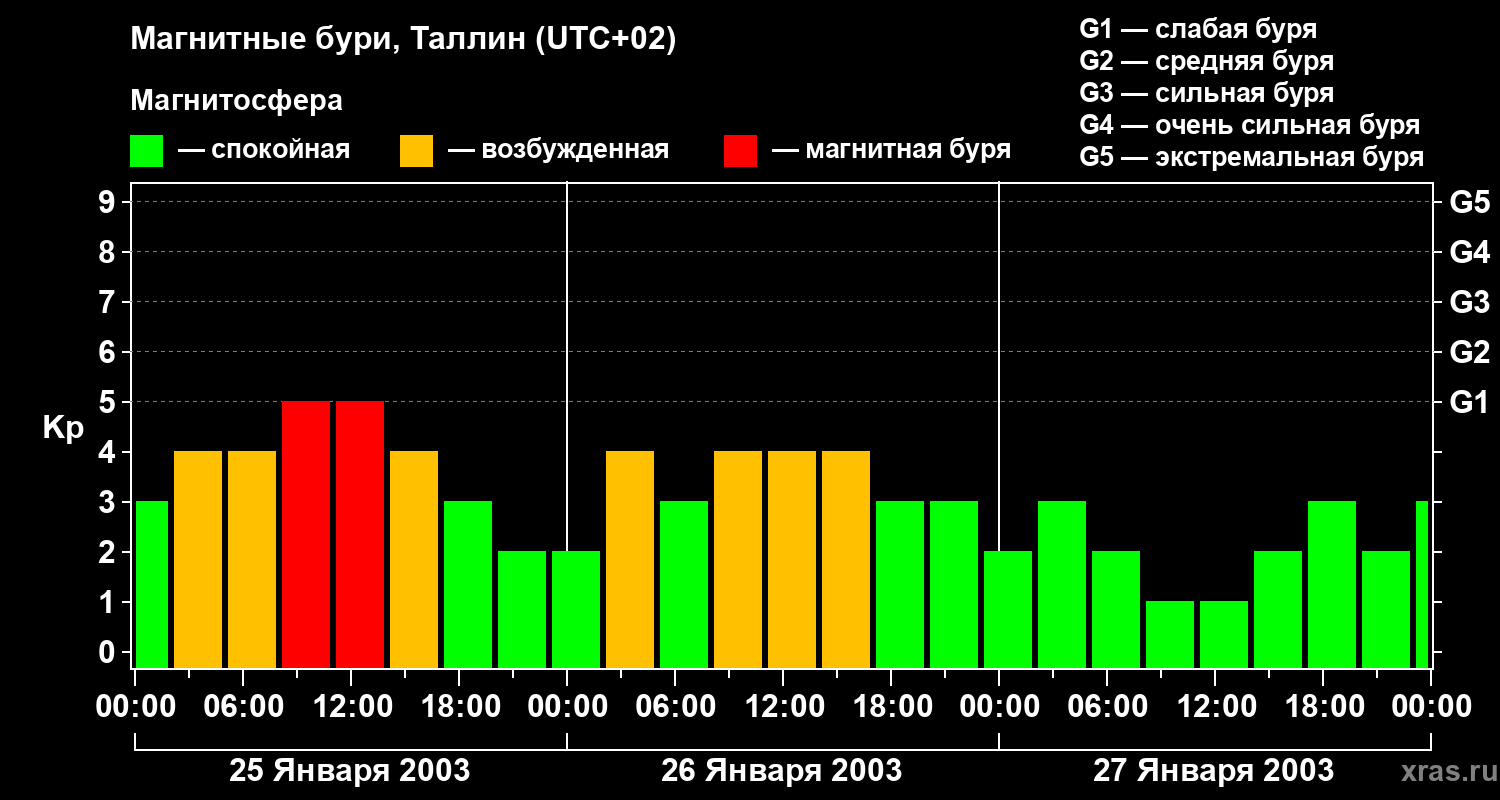 Изменения геомагнитного индекса Kp с 25 по 27 января 2003 года для средних широт