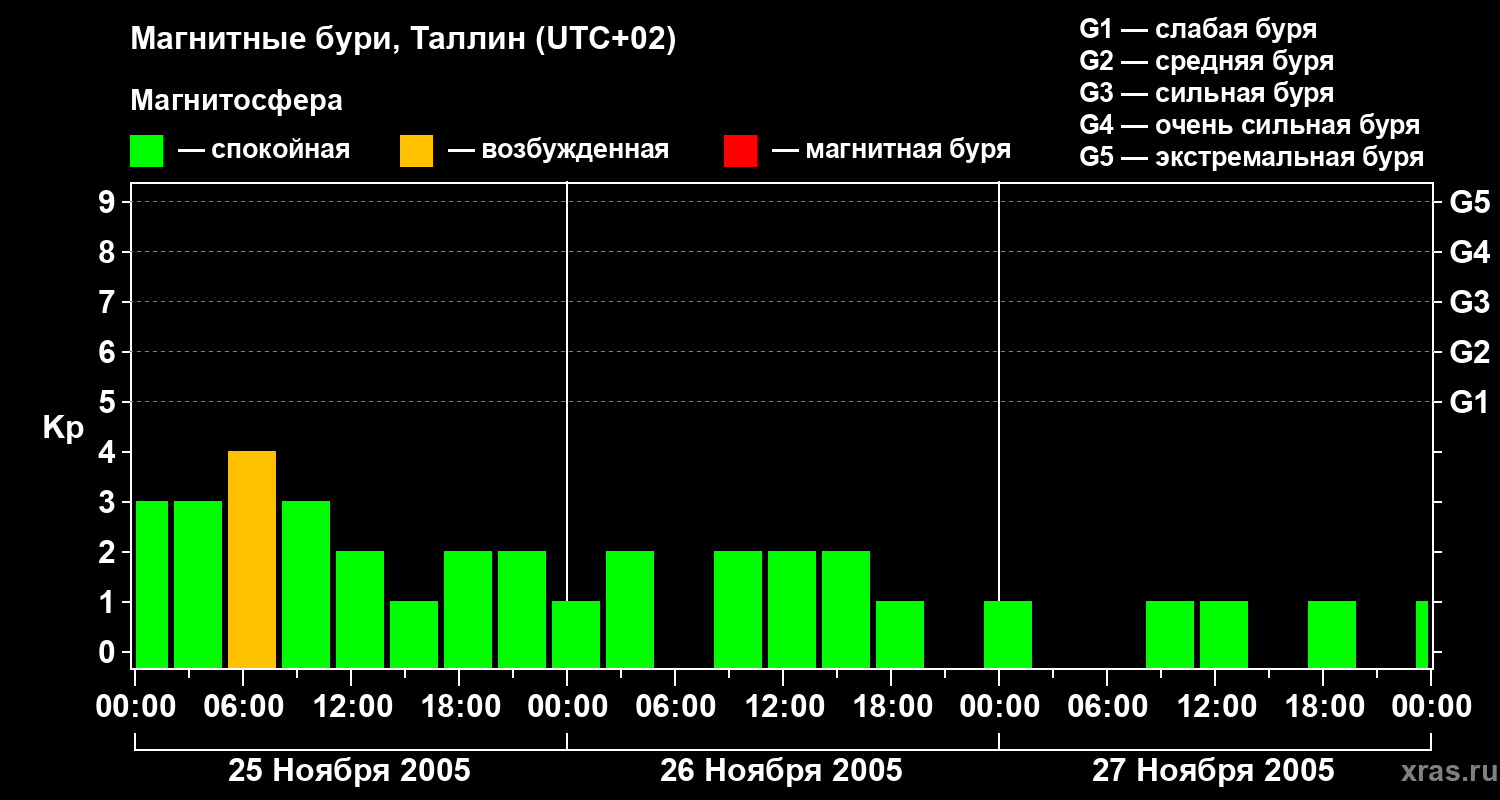 Изменения геомагнитного индекса Kp с 25 по 27 ноября 2005 года для средних широт