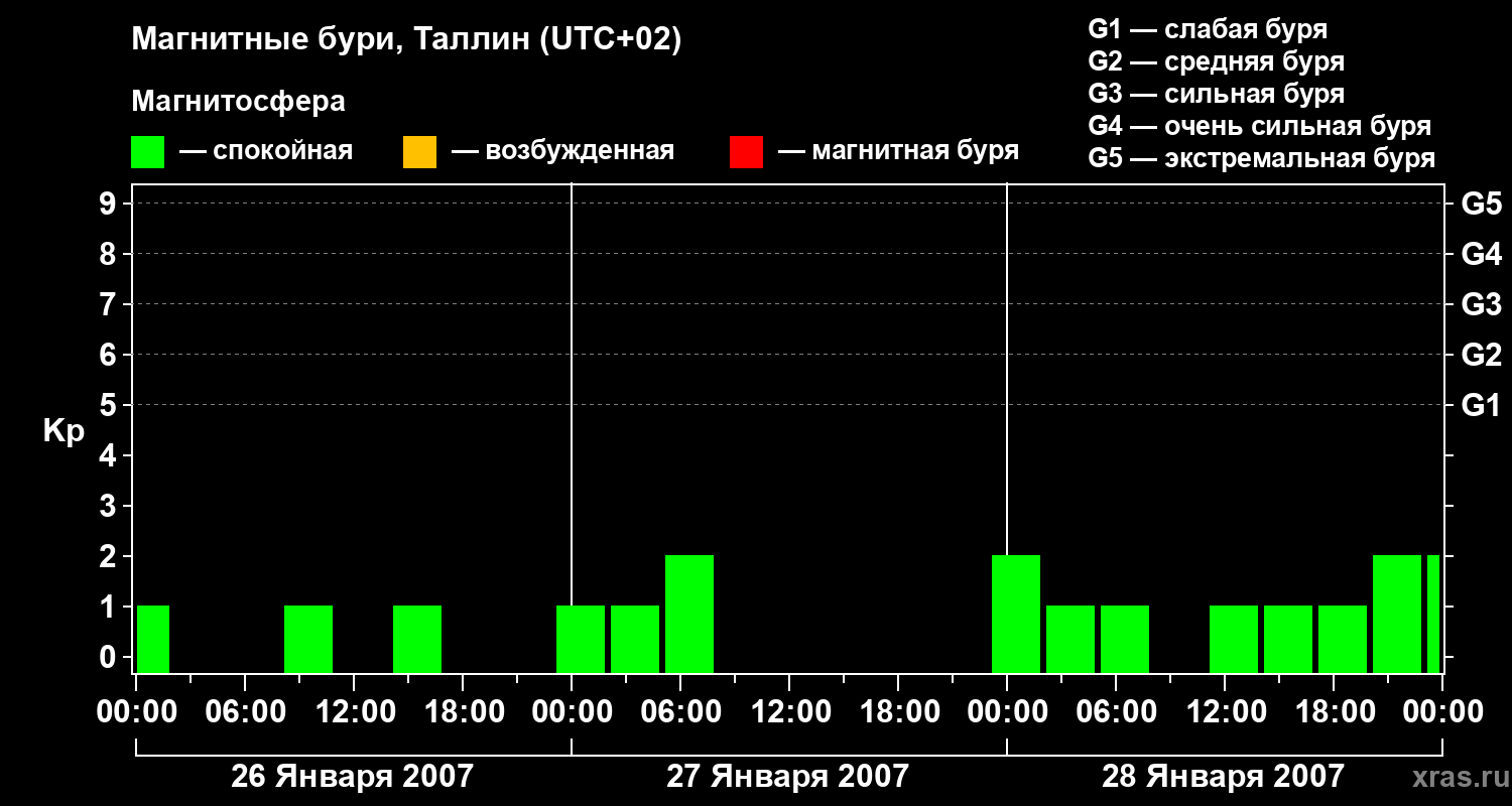 Изменения геомагнитного индекса Kp с 26 по 28 января 2007 года для средних широт