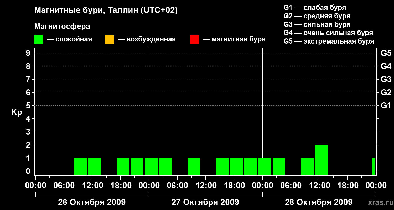 Изменения геомагнитного индекса Kp с 26 по 28 октября 2009 года для средних широт
