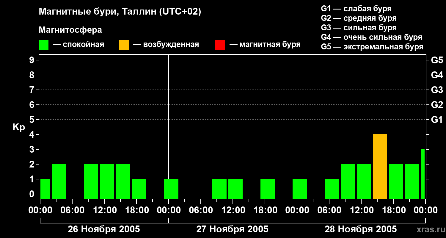 Изменения геомагнитного индекса Kp с 26 по 28 ноября 2005 года для средних широт