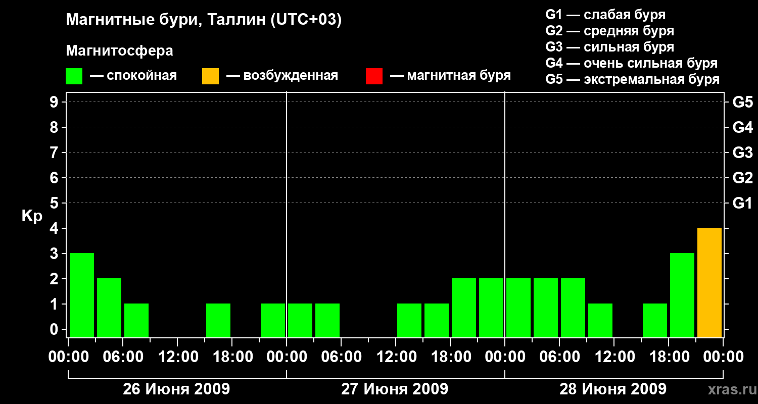 Изменения геомагнитного индекса Kp с 26 по 28 июня 2009 года для средних широт