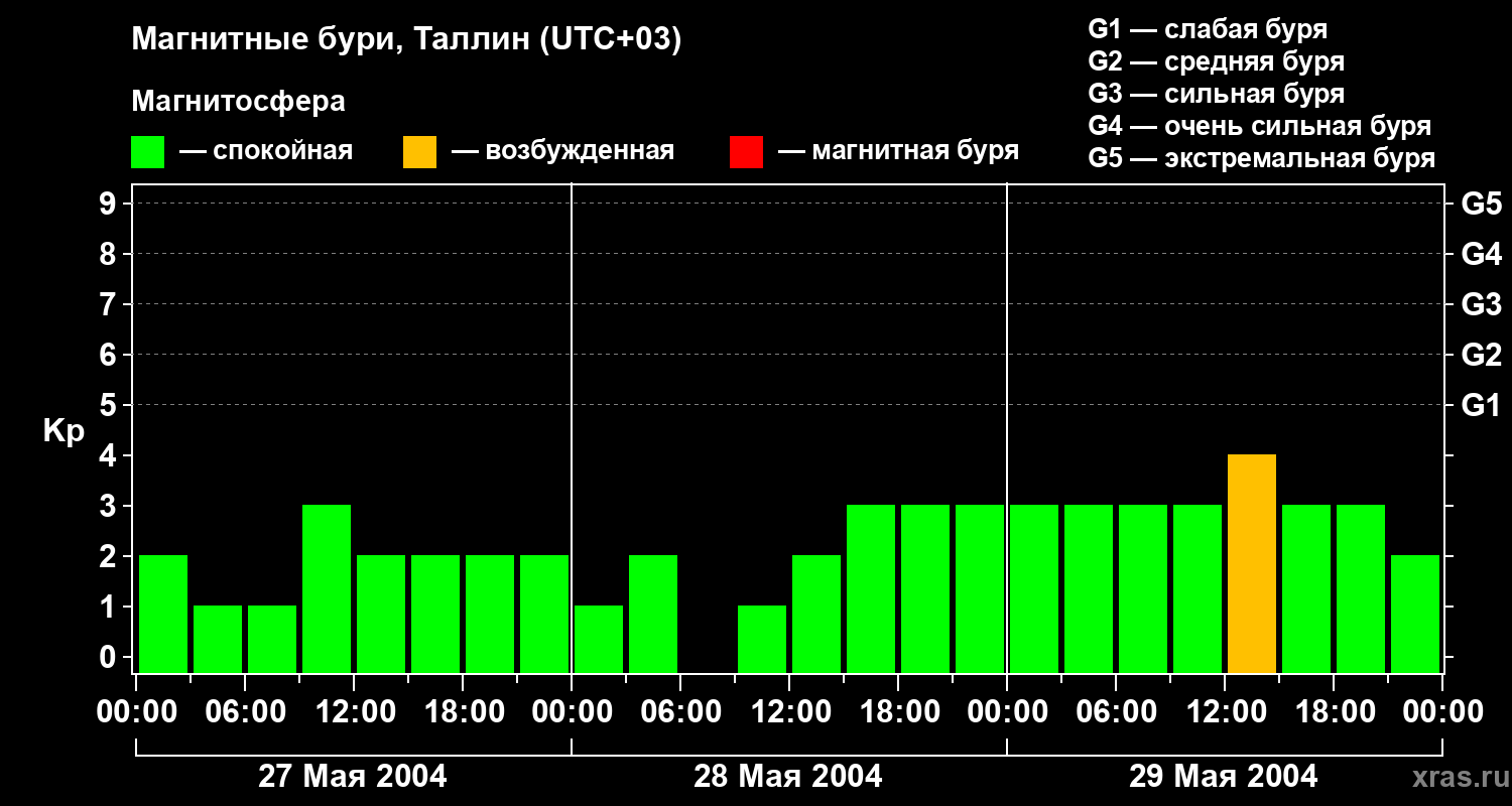 Изменения геомагнитного индекса Kp с 27 по 29 мая 2004 года для средних широт