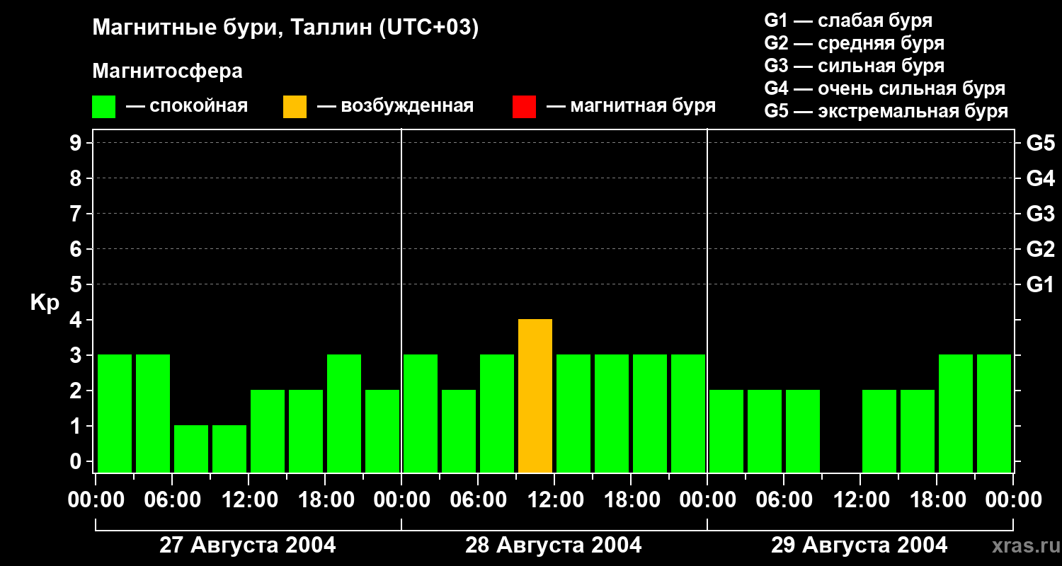 Изменения геомагнитного индекса Kp с 27 по 29 августа 2004 года для средних широт