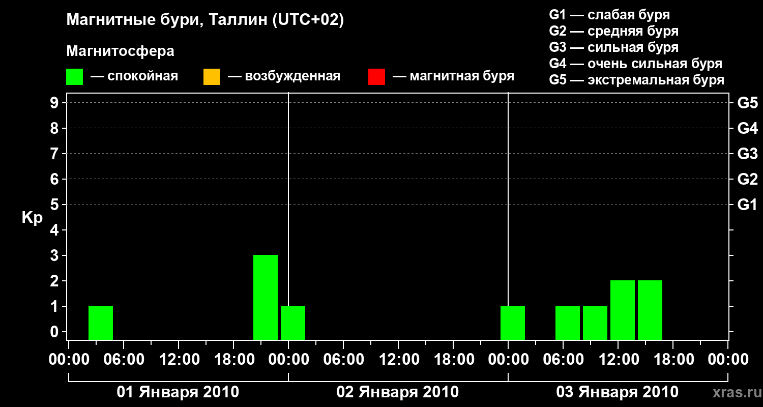 Изменения геомагнитного индекса Kp с 1 по 3 января 2010 года для средних широт
