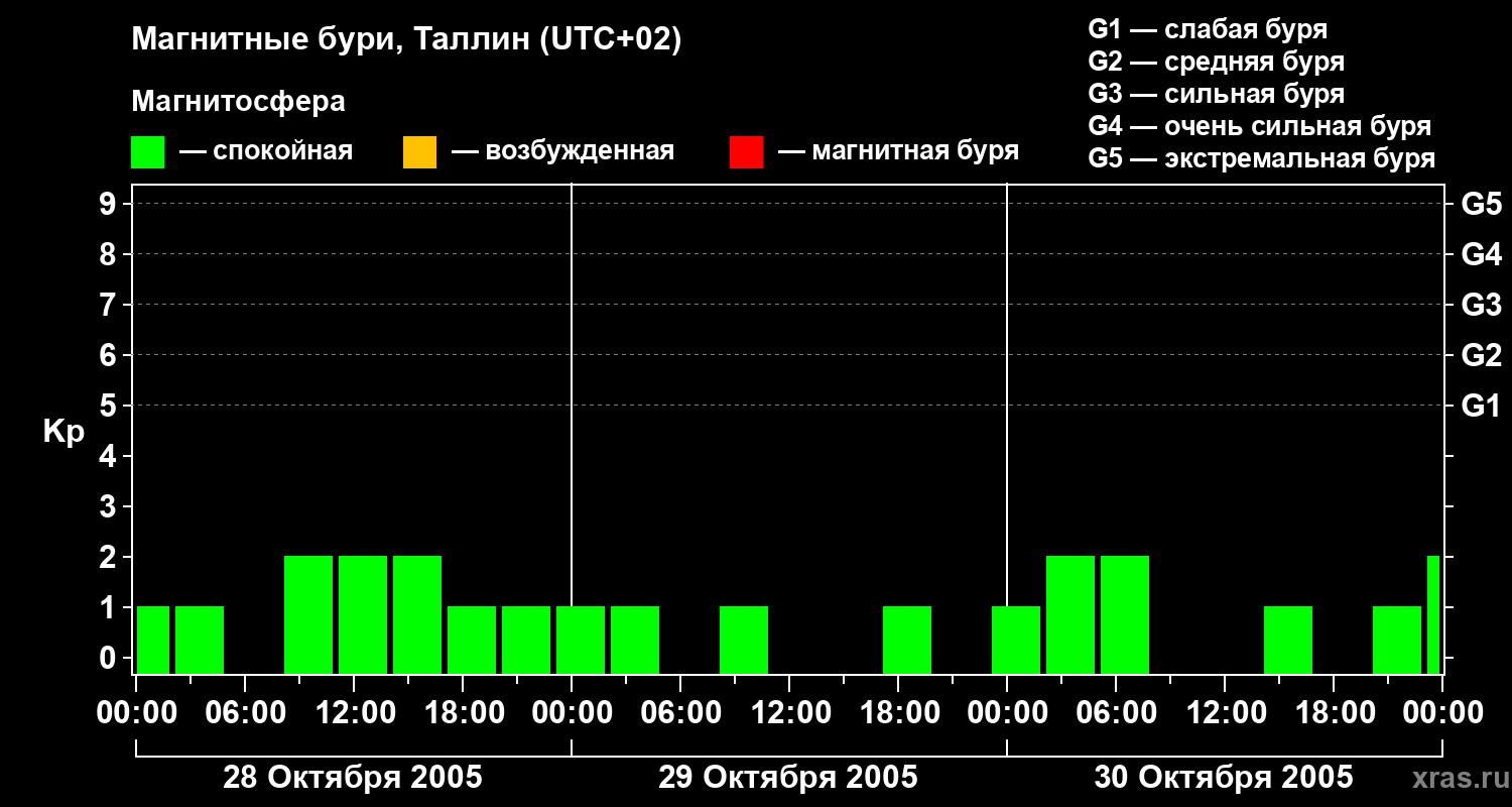 Изменения геомагнитного индекса Kp с 28 по 30 октября 2005 года для средних широт