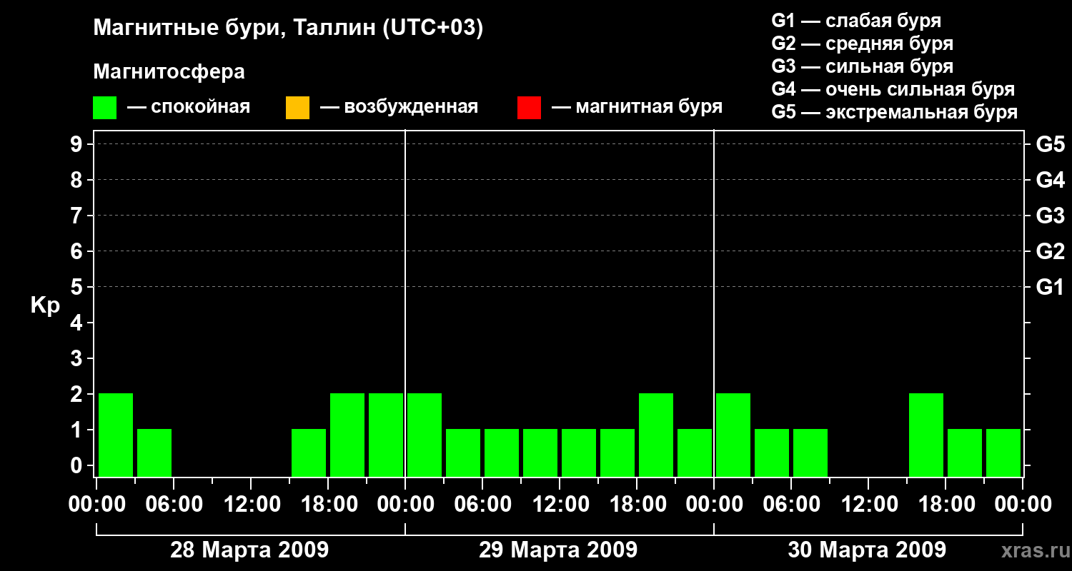 Изменения геомагнитного индекса Kp с 28 по 30 марта 2009 года для средних широт