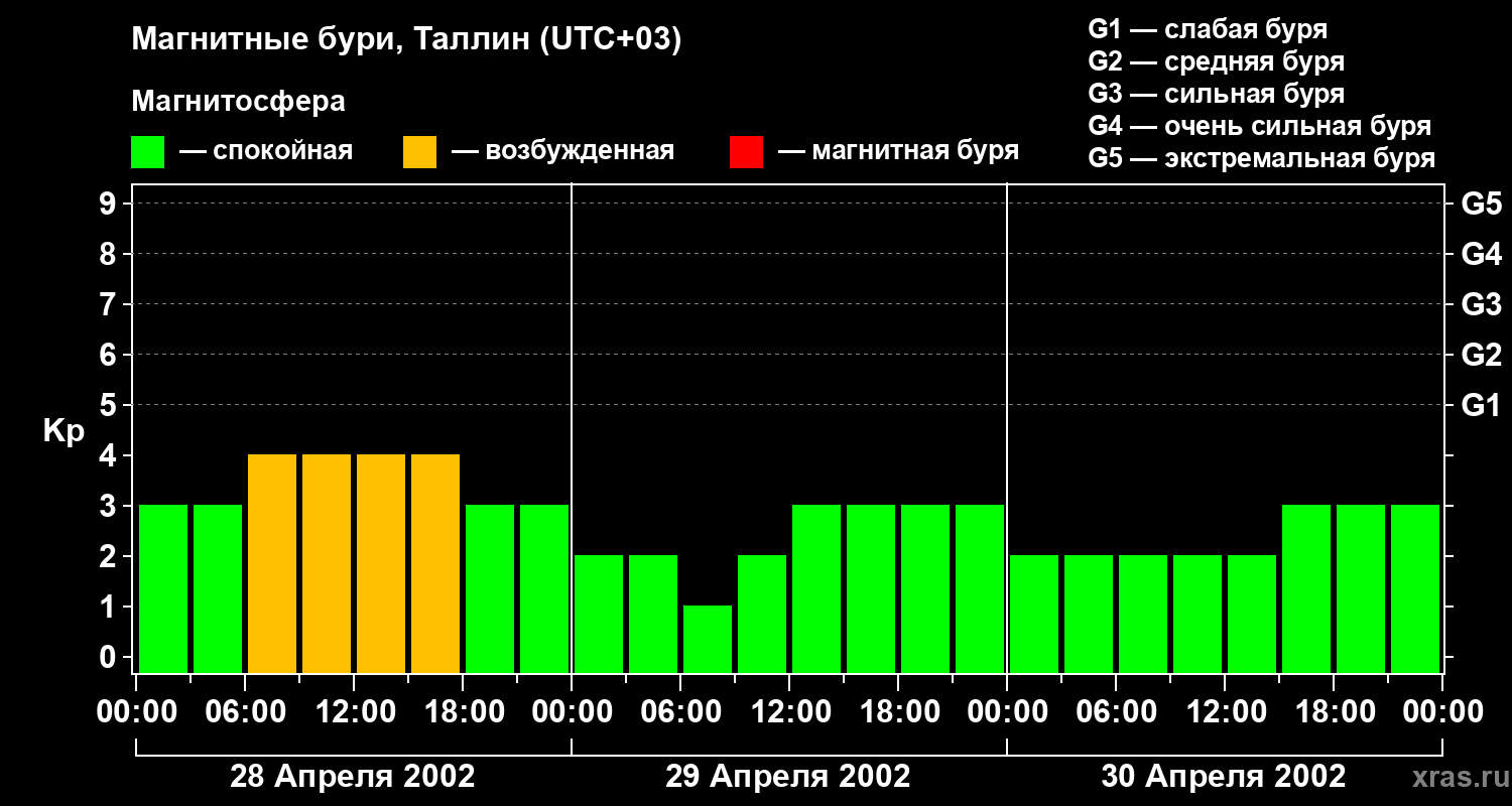 Изменения геомагнитного индекса Kp с 28 по 30 апреля 2002 года для средних широт