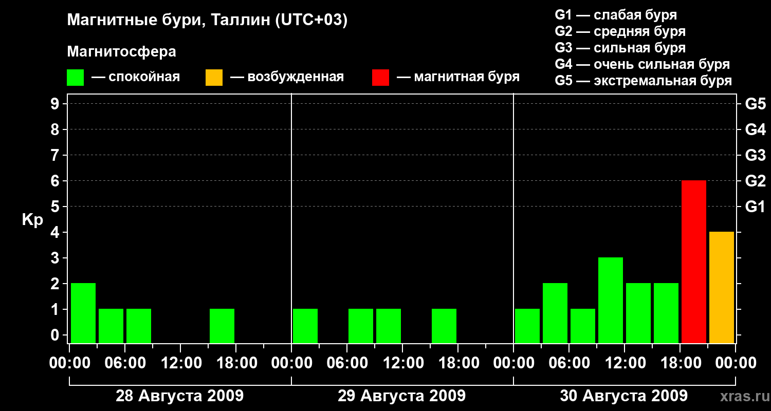 Изменения геомагнитного индекса Kp с 28 по 30 августа 2009 года для средних широт