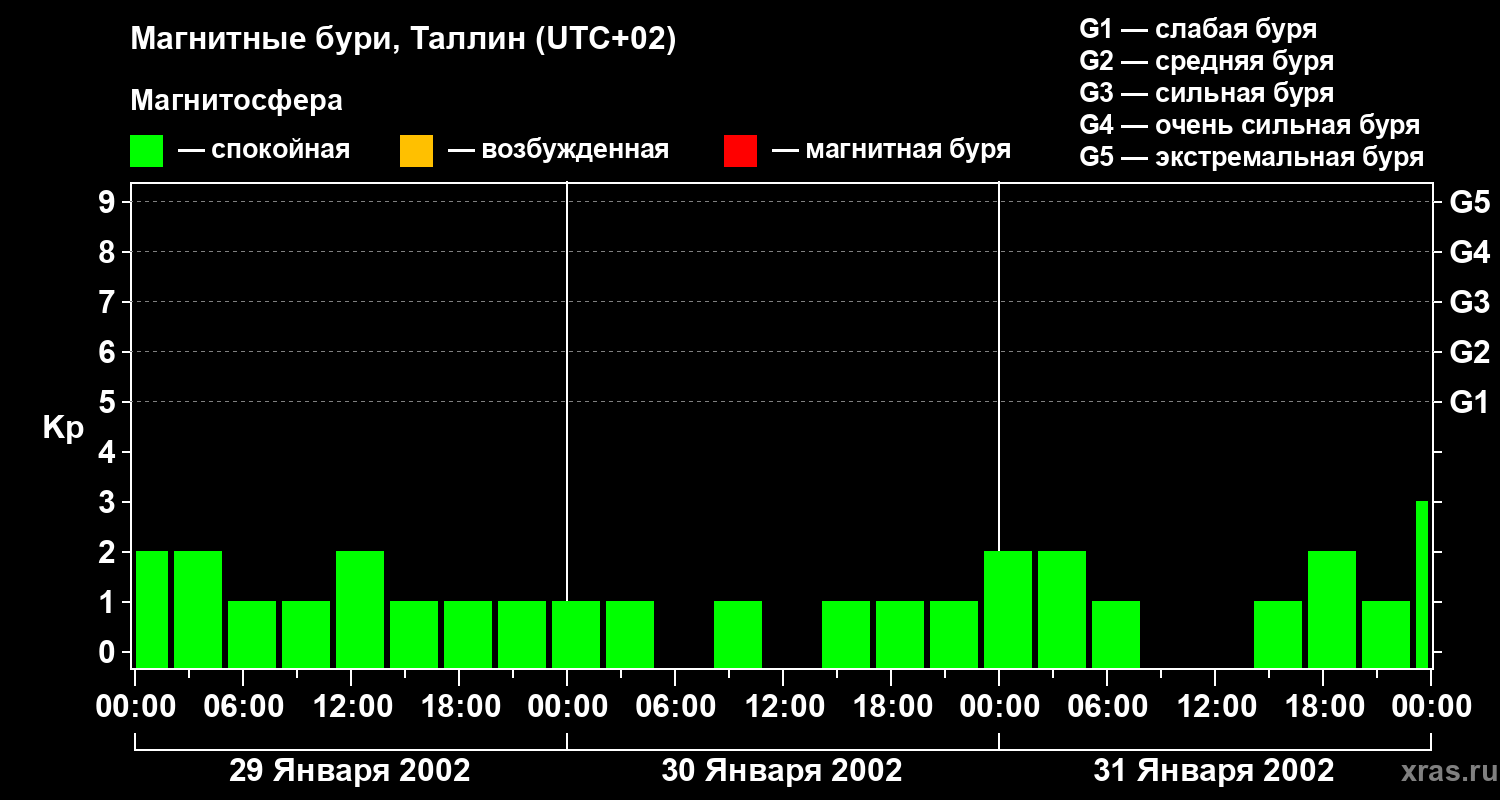 Изменения геомагнитного индекса Kp с 29 по 31 января 2002 года для средних широт