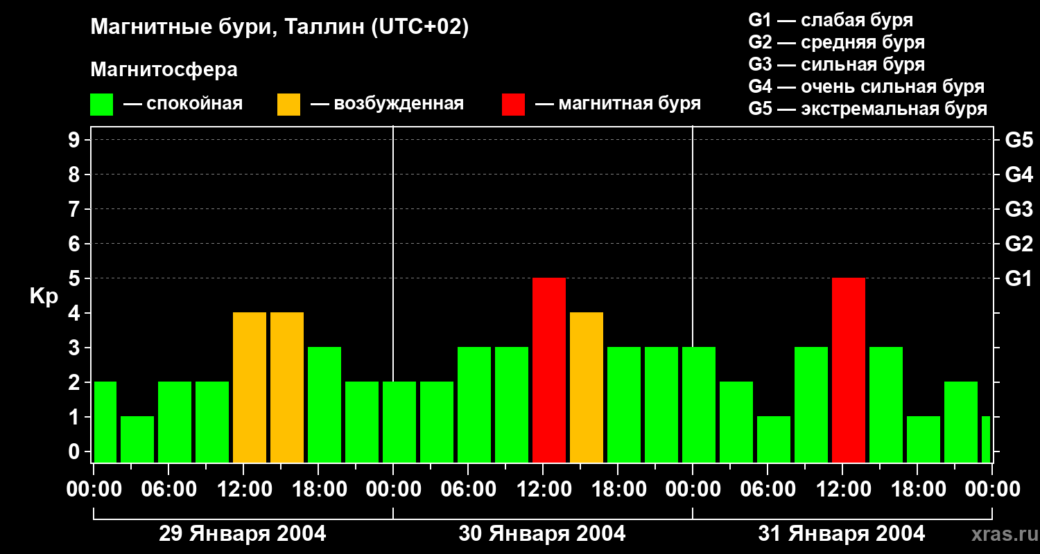 Изменения геомагнитного индекса Kp с 29 по 31 января 2004 года для средних широт