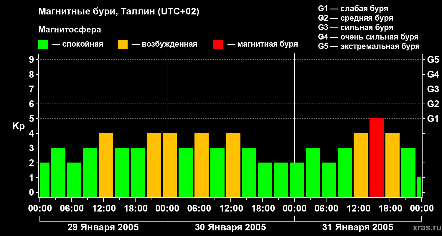 Изменения геомагнитного индекса Kp с 29 по 31 января 2005 года для средних широт