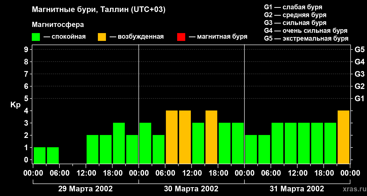 Изменения геомагнитного индекса Kp с 29 по 31 марта 2002 года для средних широт