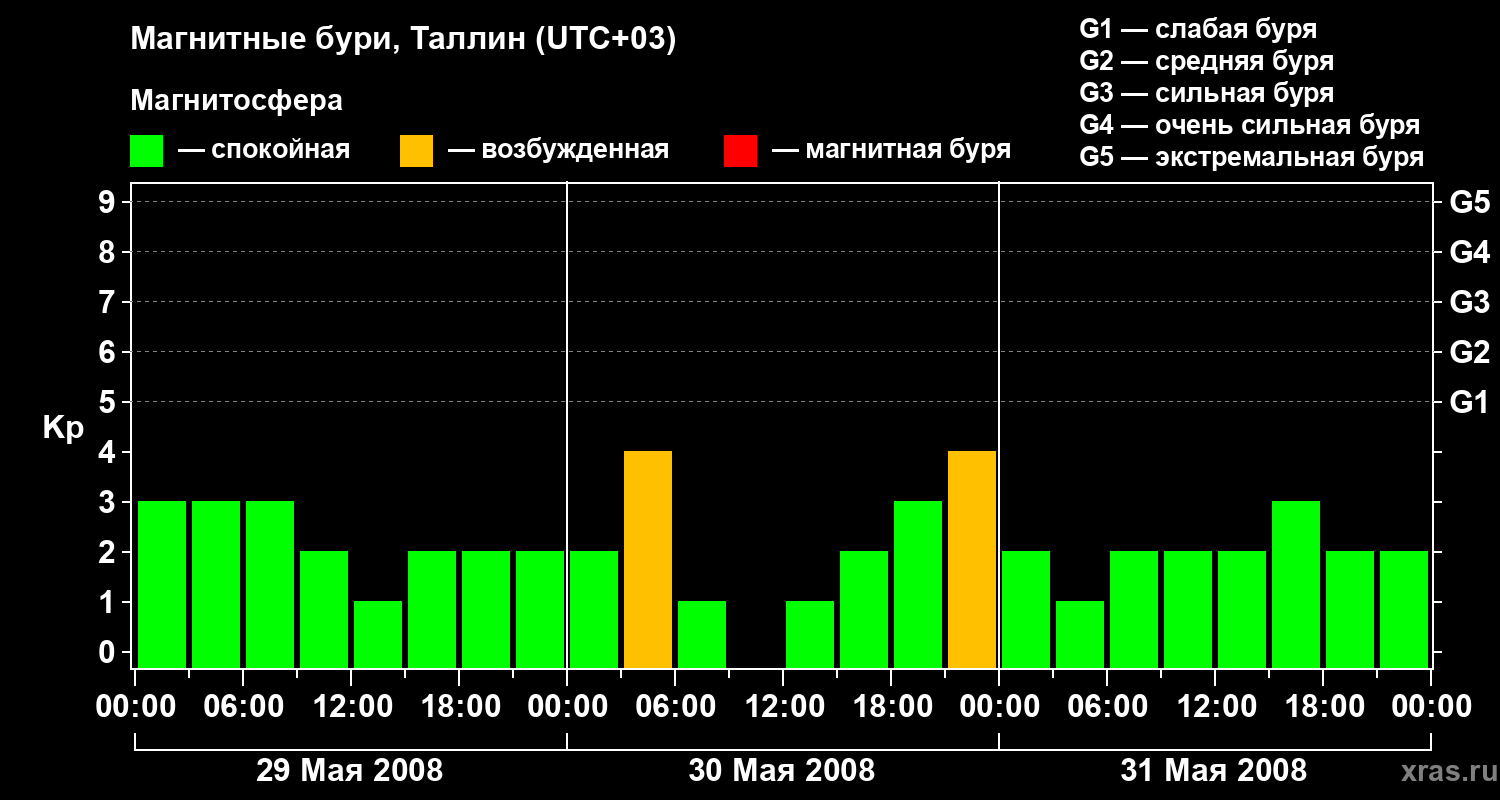 Изменения геомагнитного индекса Kp с 29 по 31 мая 2008 года для средних широт