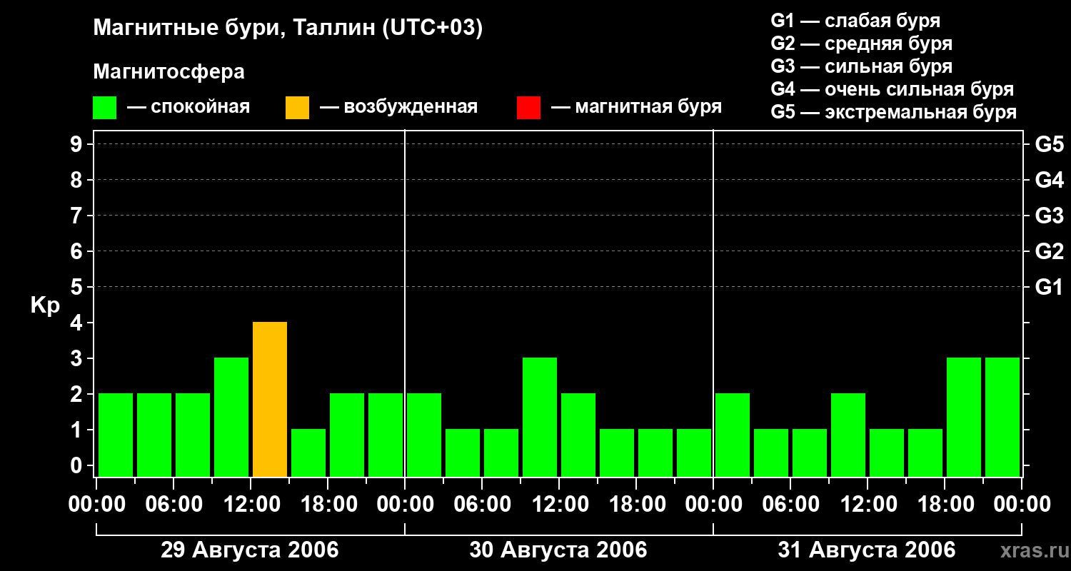 Изменения геомагнитного индекса Kp с 29 по 31 августа 2006 года для средних широт