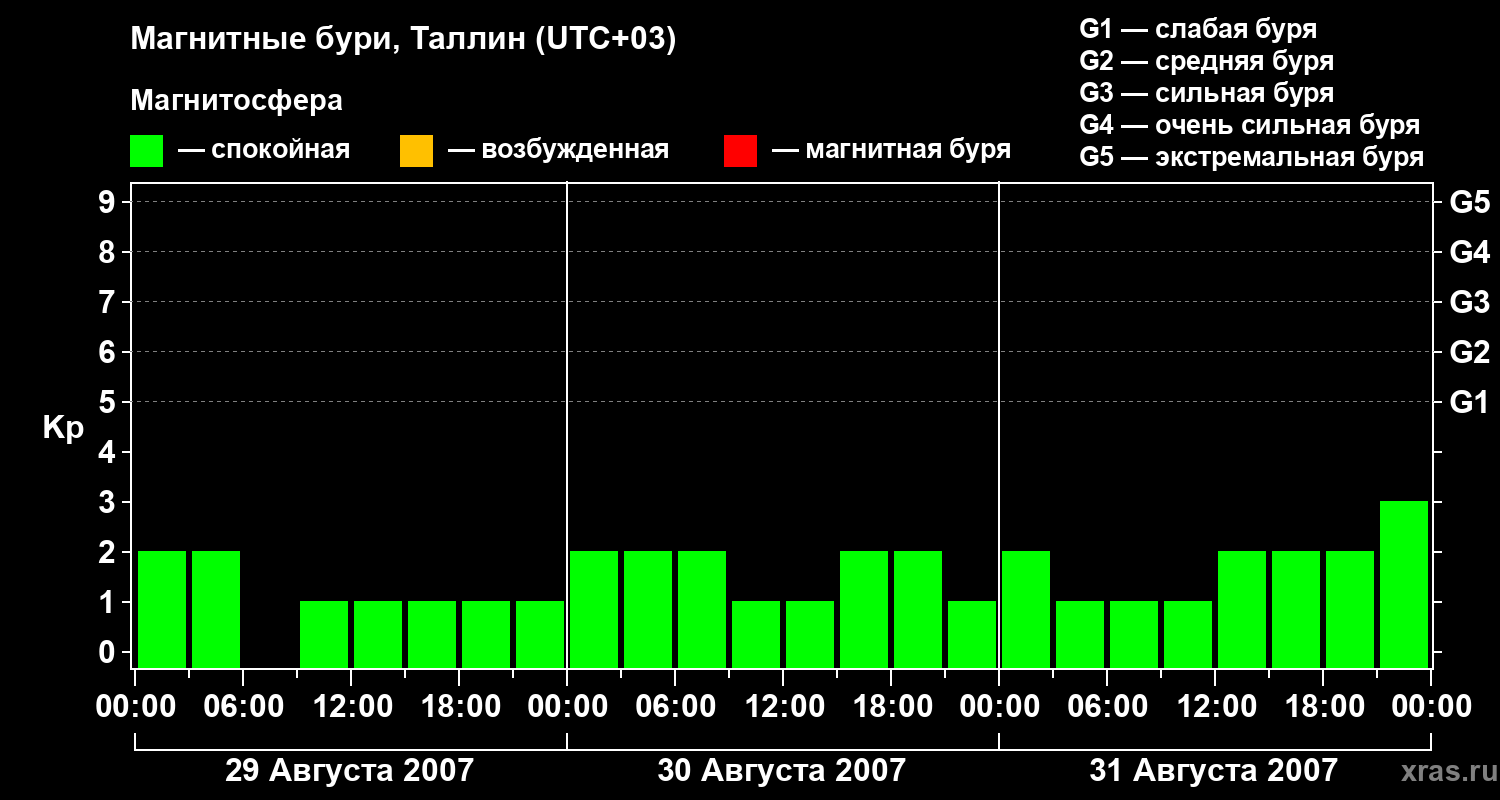 Изменения геомагнитного индекса Kp с 29 по 31 августа 2007 года для средних широт
