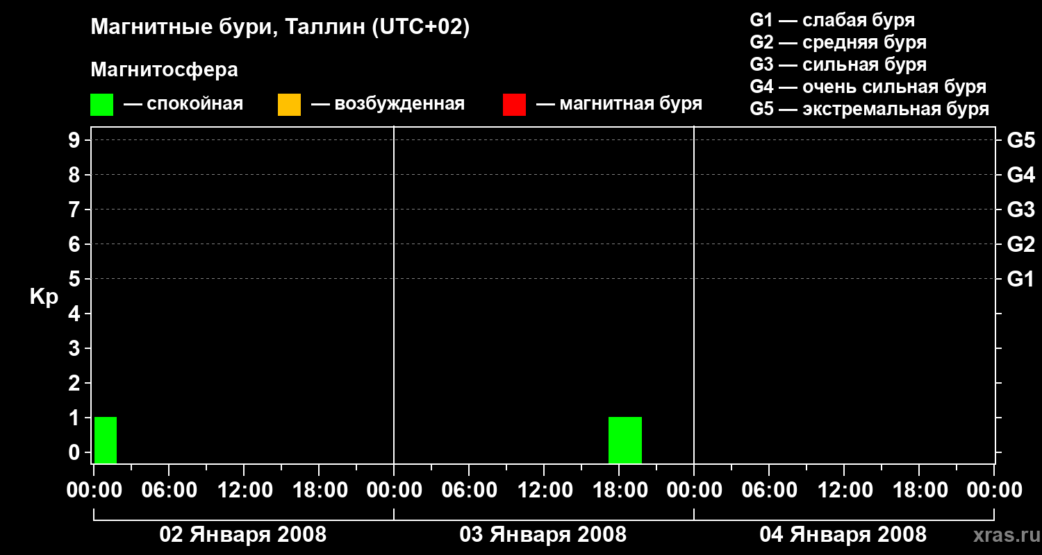Изменения геомагнитного индекса Kp с 2 по 4 января 2008 года для средних широт