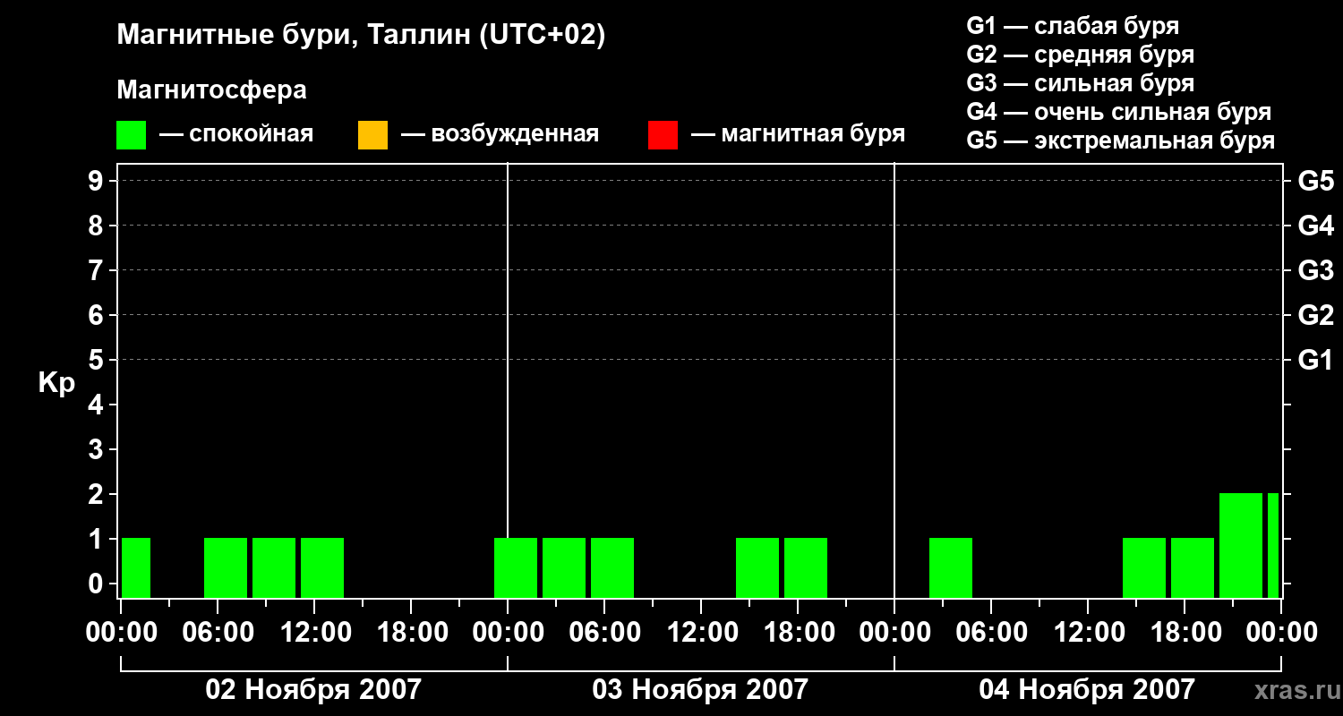 Изменения геомагнитного индекса Kp с 2 по 4 ноября 2007 года для средних широт