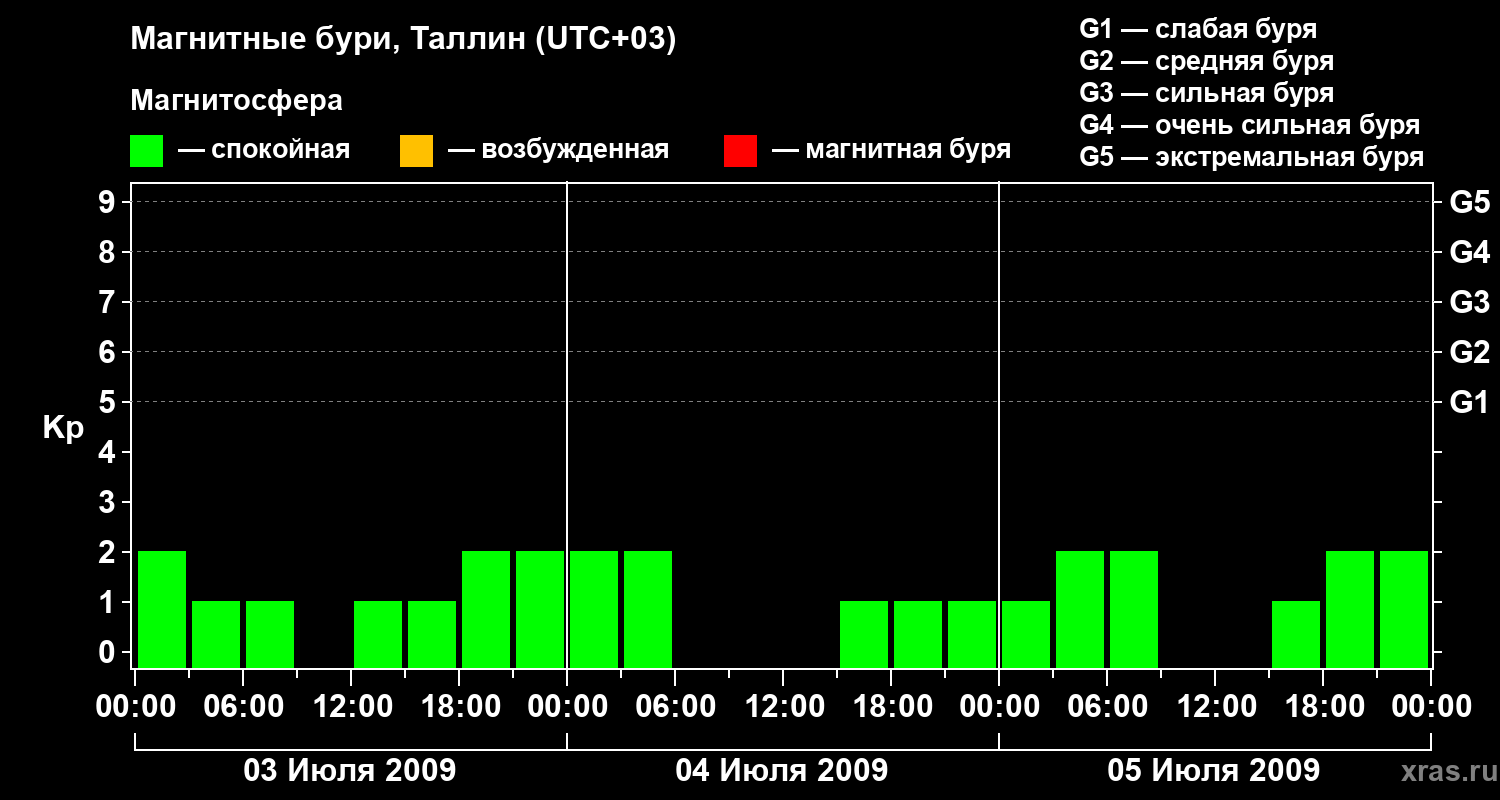 Изменения геомагнитного индекса Kp с 3 по 5 июля 2009 года для средних широт