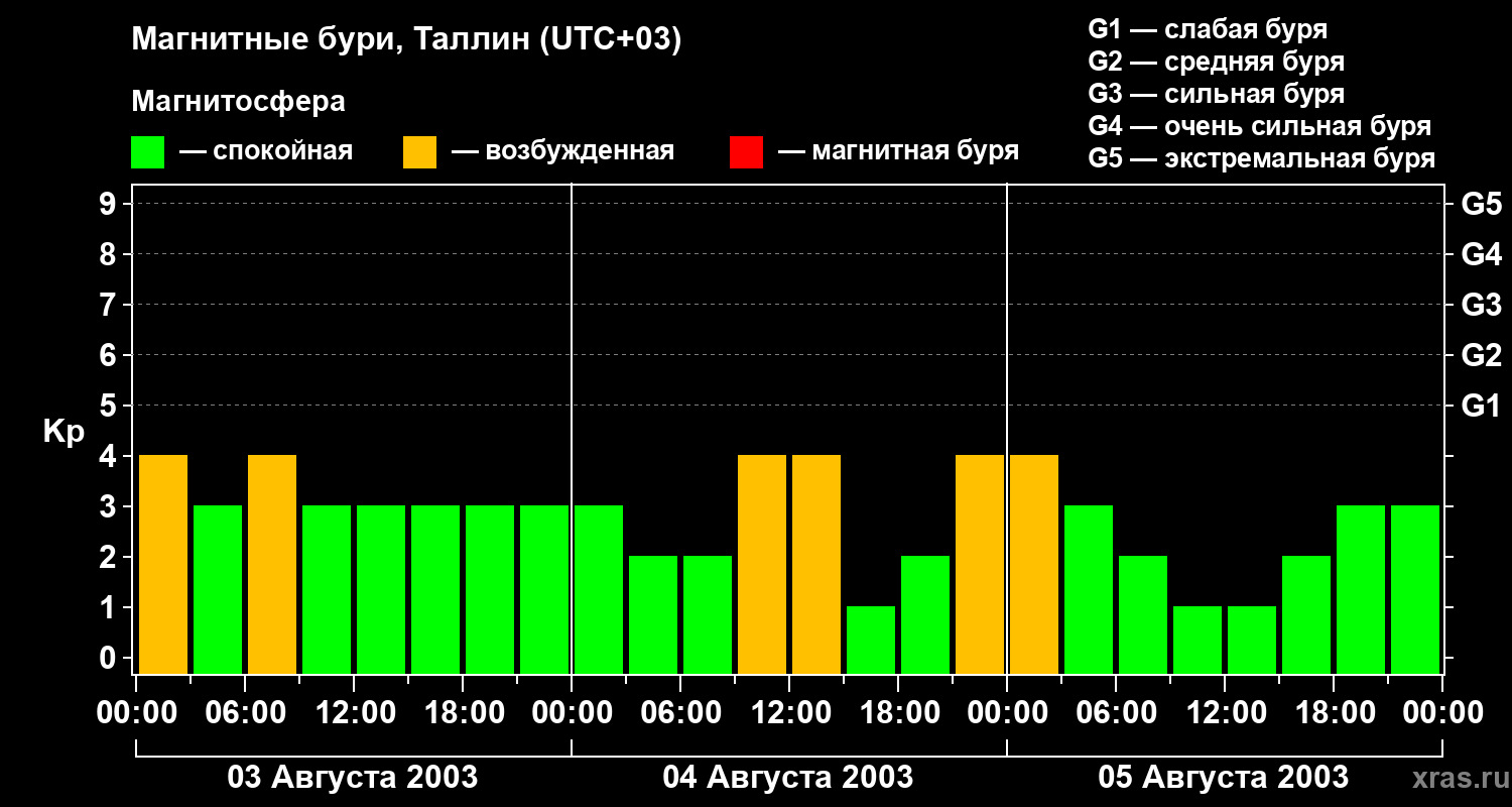Изменения геомагнитного индекса Kp с 3 по 5 августа 2003 года для средних широт