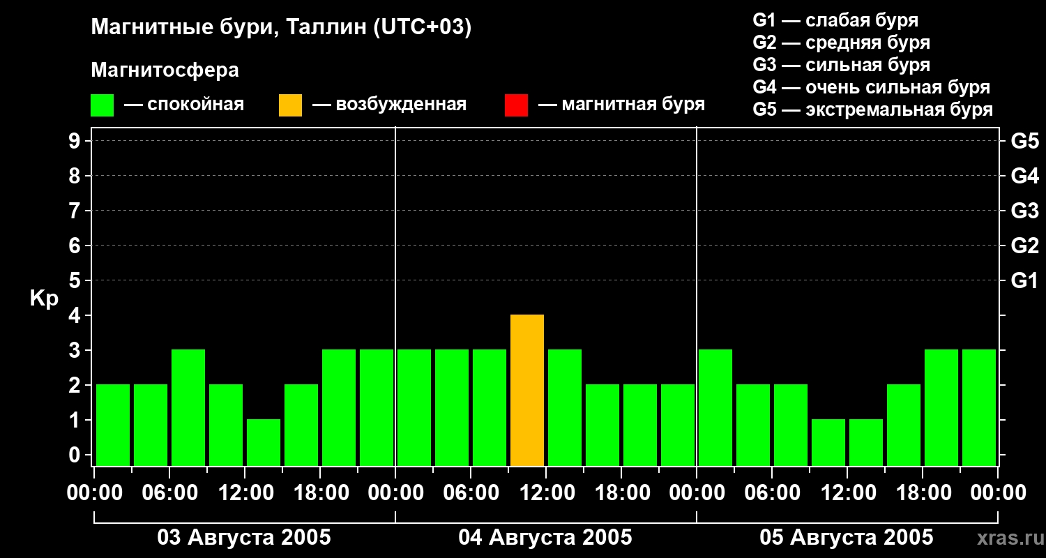 Изменения геомагнитного индекса Kp с 3 по 5 августа 2005 года для средних широт