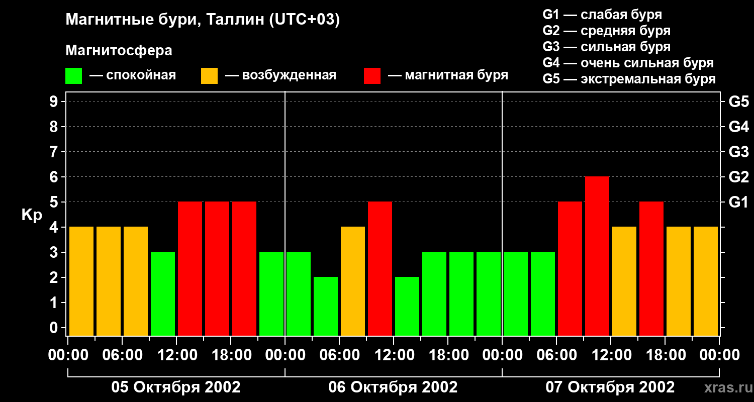 Изменения геомагнитного индекса Kp с 5 по 7 октября 2002 года для средних широт