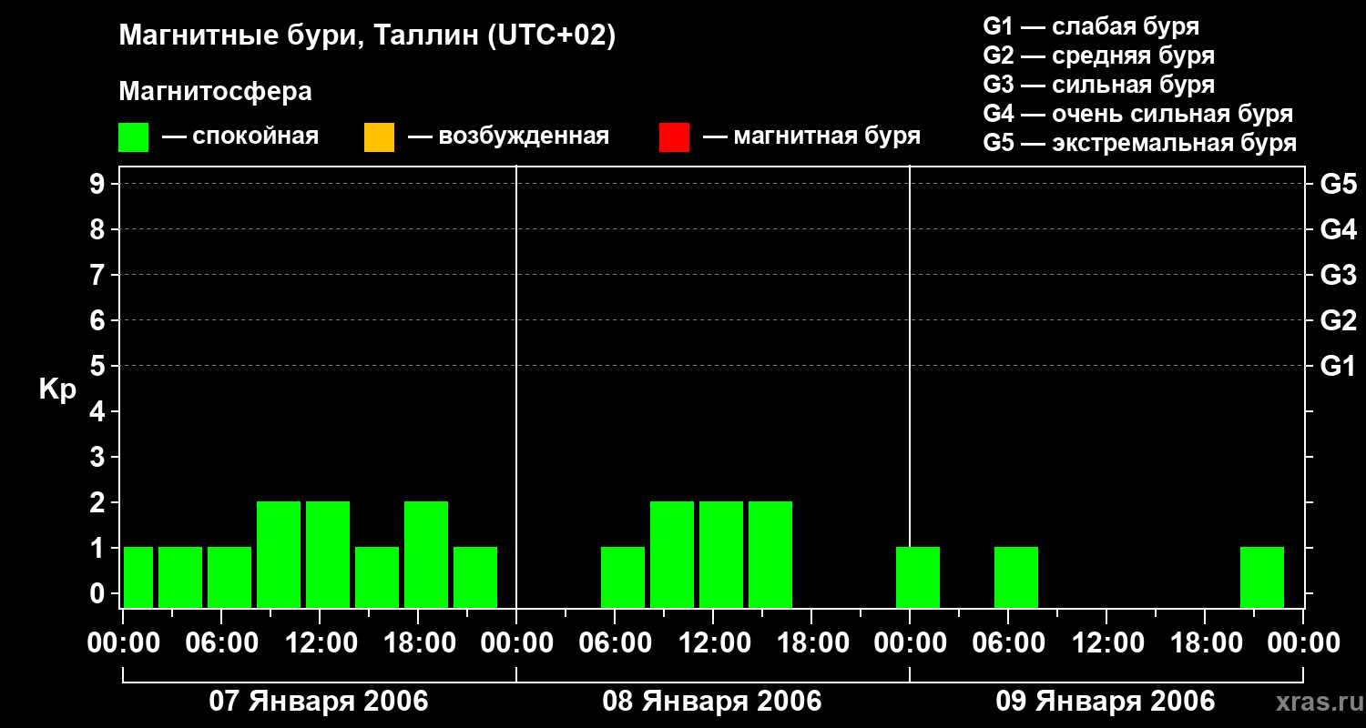 Изменения геомагнитного индекса Kp с 7 по 9 января 2006 года для средних широт