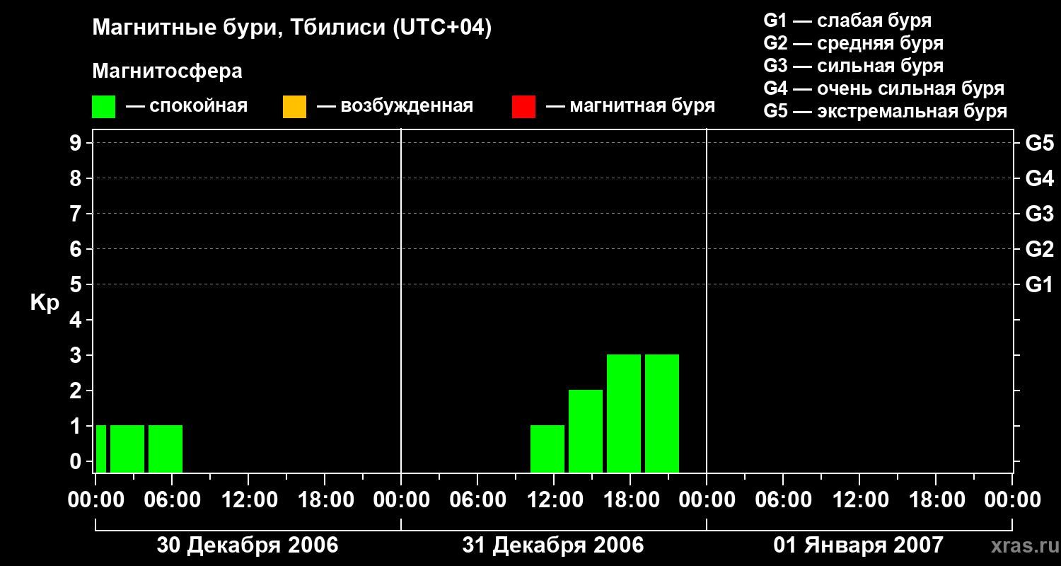 Изменения геомагнитного индекса Kp с 30 декабря 2006 года по 1 января 2007 года для средних широт