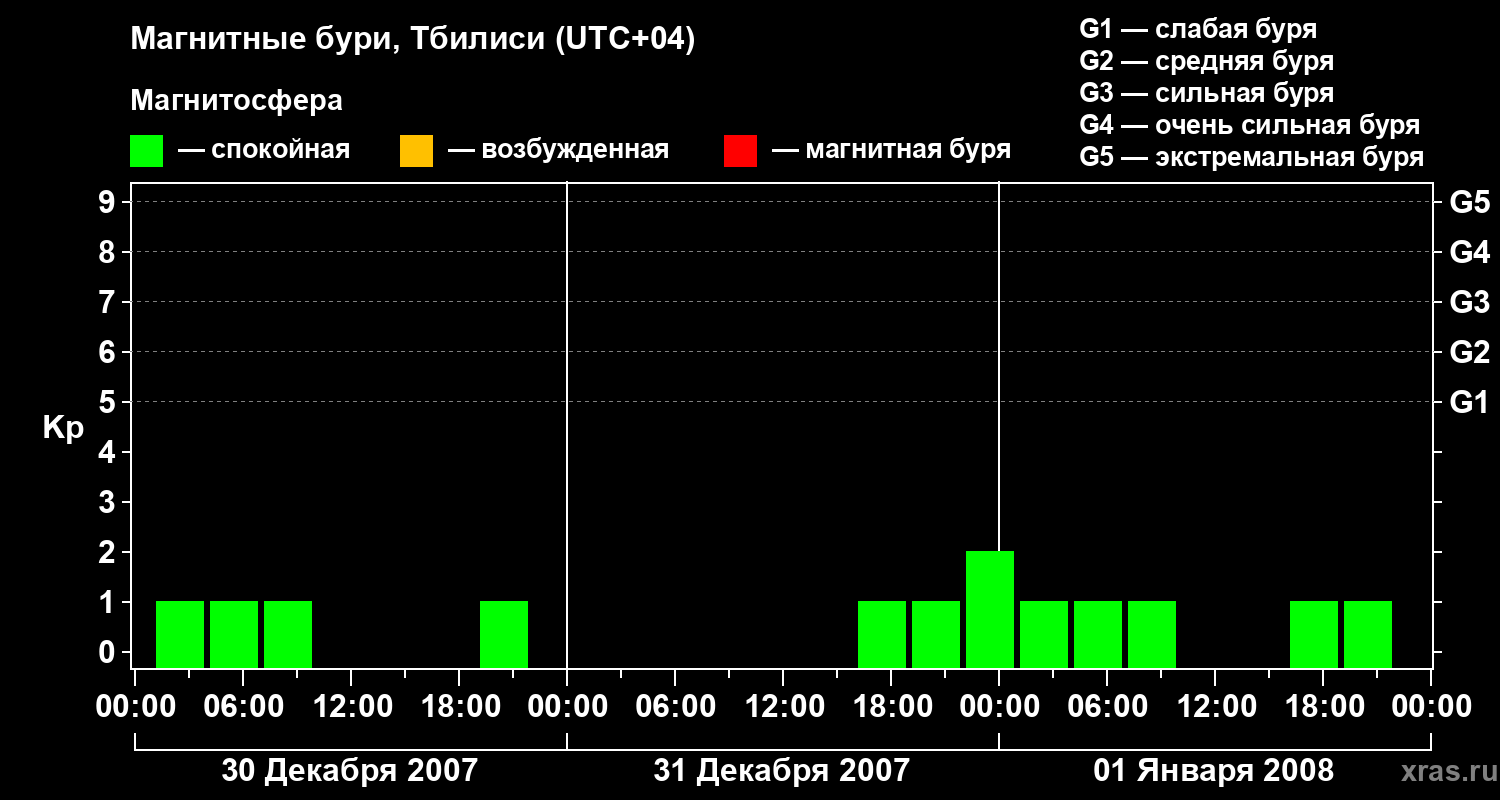 Изменения геомагнитного индекса Kp с 30 декабря 2007 года по 1 января 2008 года для средних широт