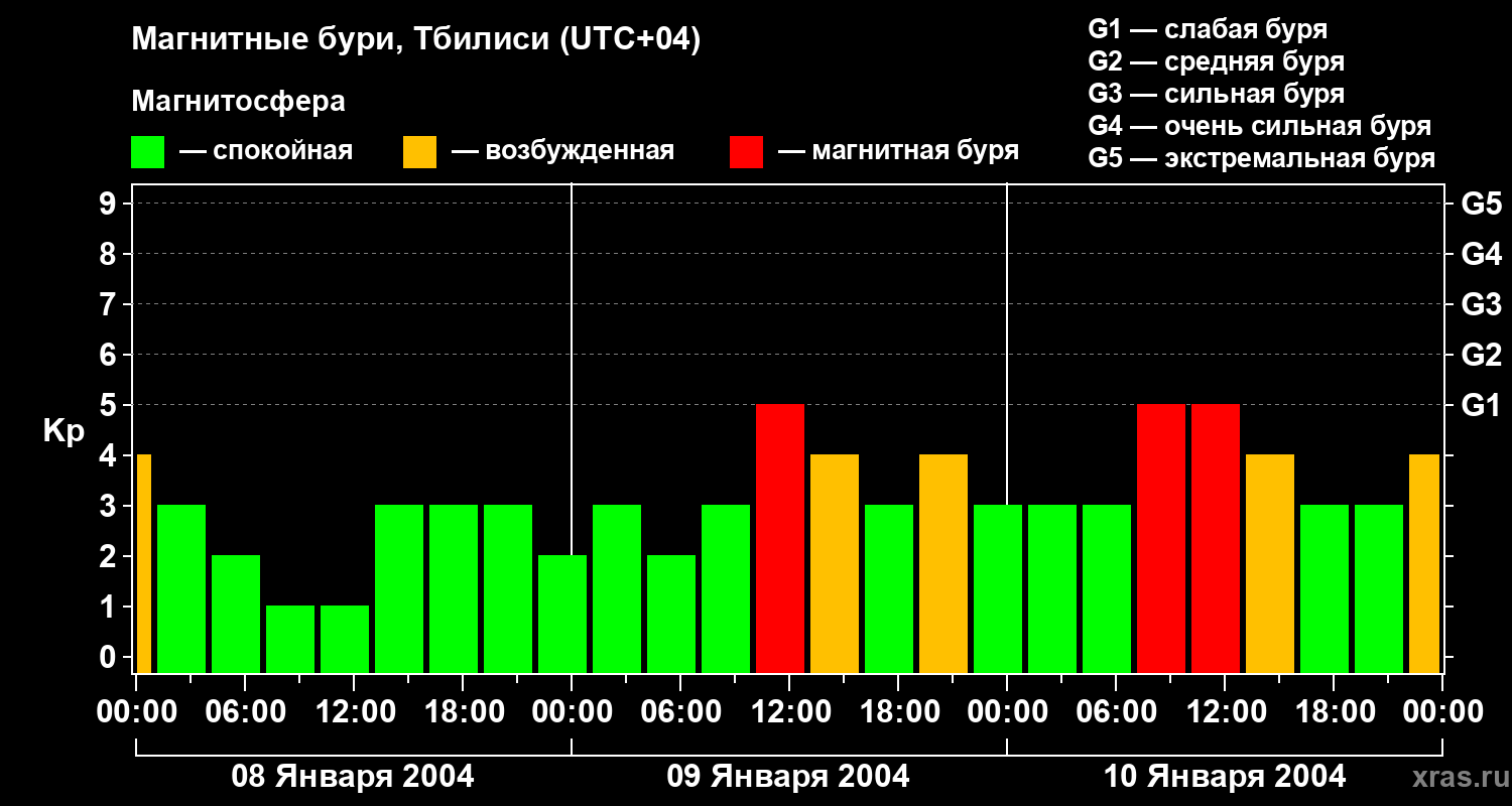 Изменения геомагнитного индекса Kp с 8 по 10 января 2004 года для средних широт