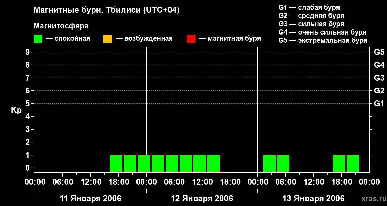 Изменения геомагнитного индекса Kp с 11 по 13 января 2006 года для средних широт