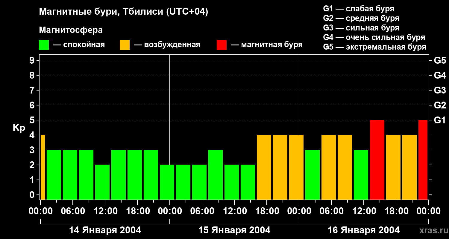 Изменения геомагнитного индекса Kp с 14 по 16 января 2004 года для средних широт