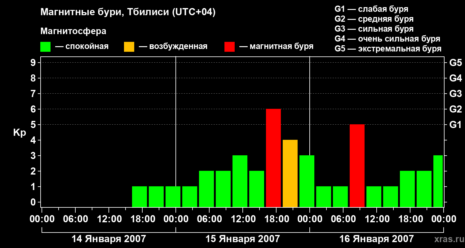 Изменения геомагнитного индекса Kp с 14 по 16 января 2007 года для средних широт