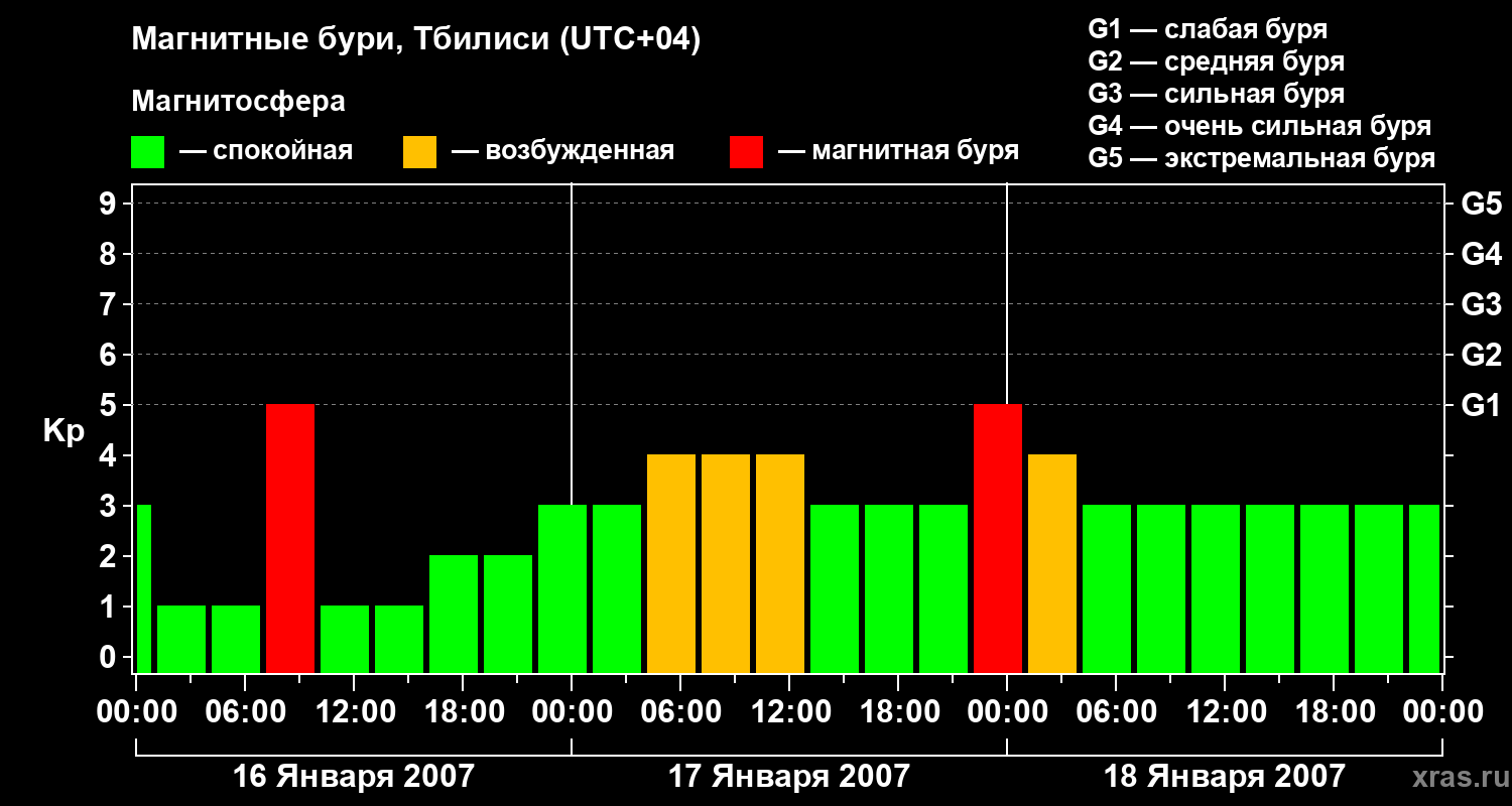 Изменения геомагнитного индекса Kp с 16 по 18 января 2007 года для средних широт