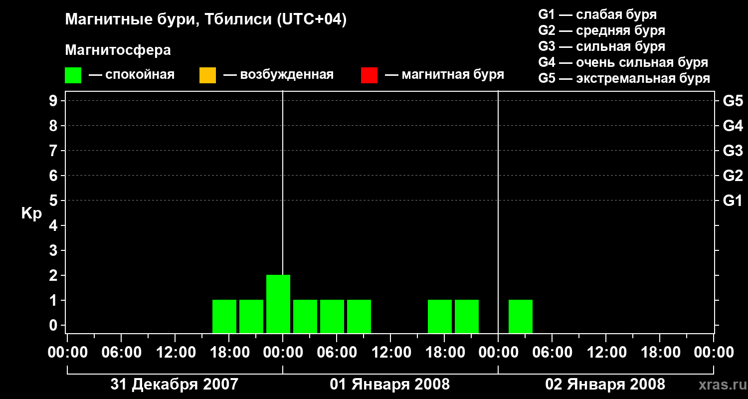 Изменения геомагнитного индекса Kp с 31 декабря 2007 года по 2 января 2008 года для средних широт
