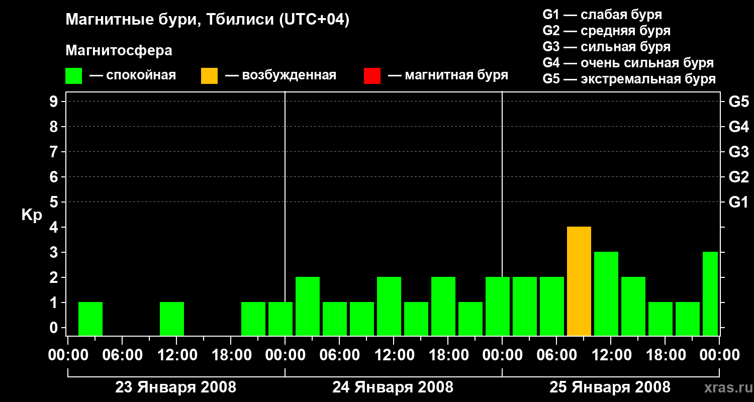 Изменения геомагнитного индекса Kp с 23 по 25 января 2008 года для средних широт