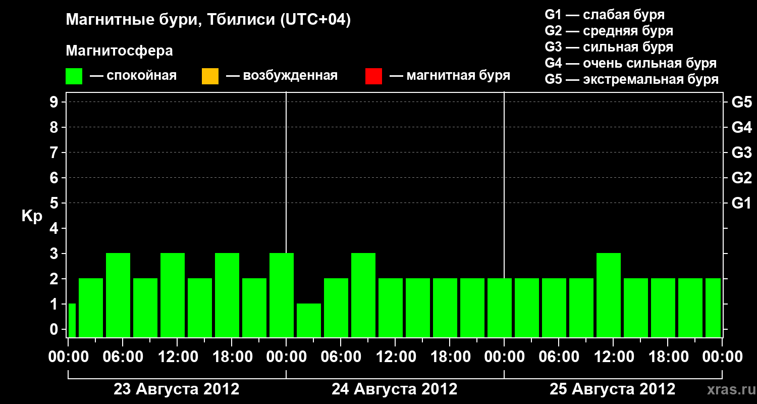 Изменения геомагнитного индекса Kp с 23 по 25 августа 2012 года для средних широт