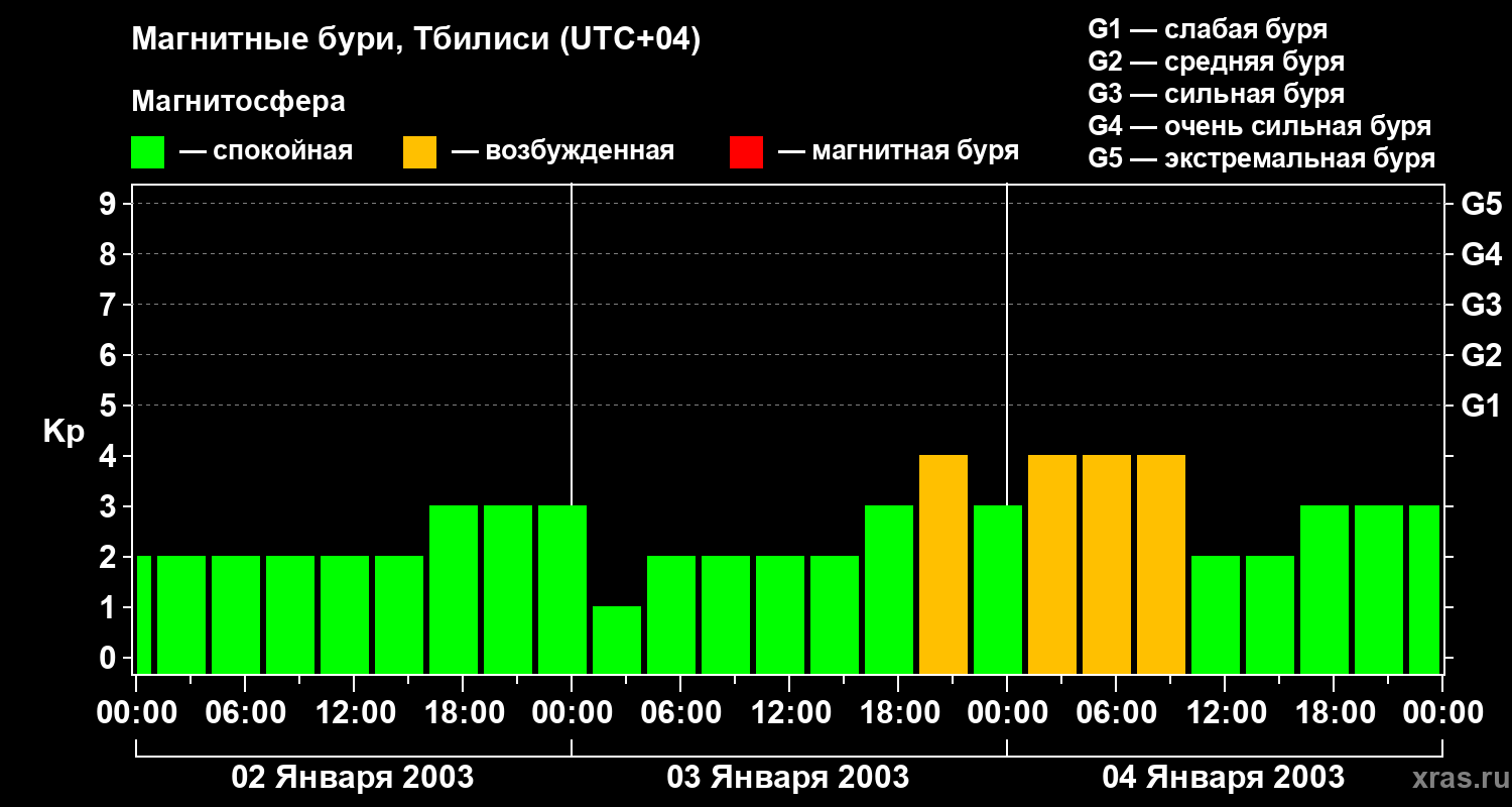Изменения геомагнитного индекса Kp с 2 по 4 января 2003 года для средних широт