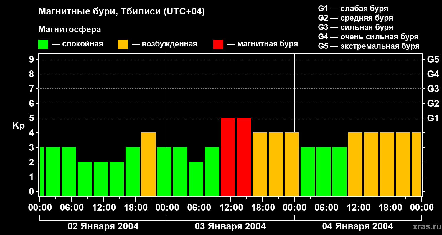 Изменения геомагнитного индекса Kp с 2 по 4 января 2004 года для средних широт