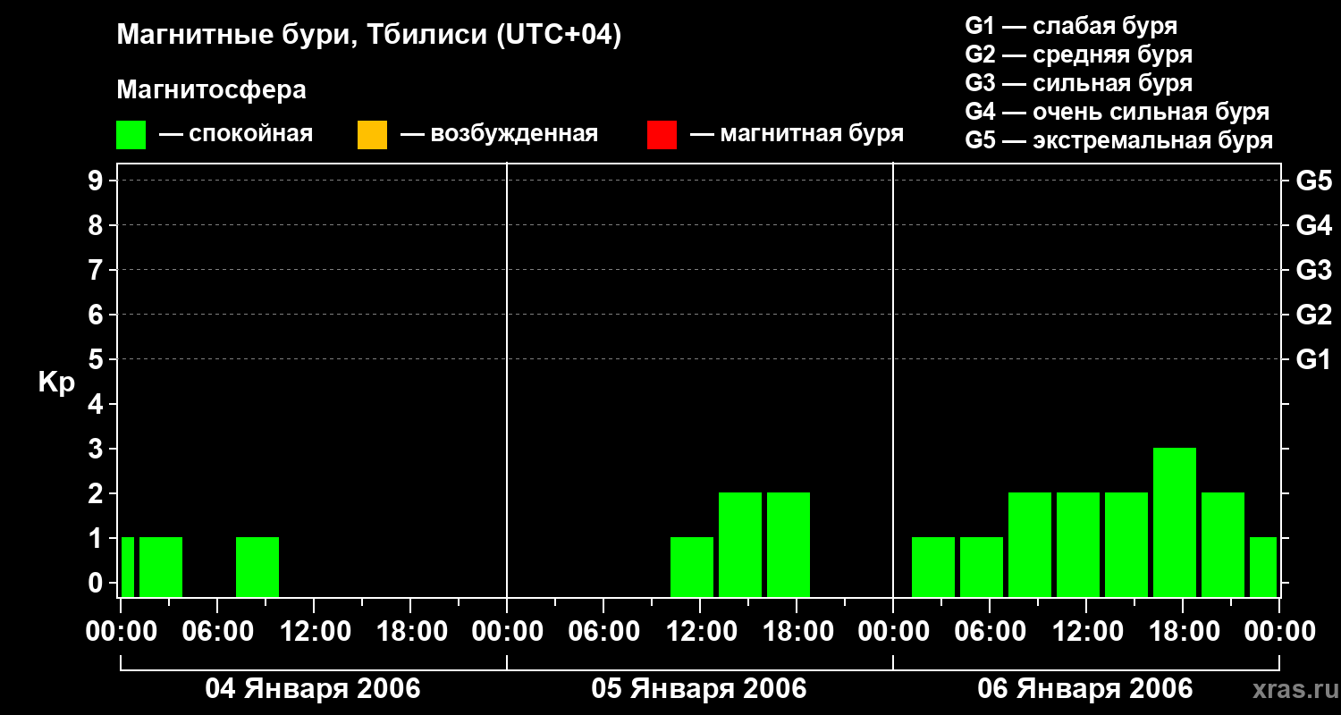 Изменения геомагнитного индекса Kp с 4 по 6 января 2006 года для средних широт