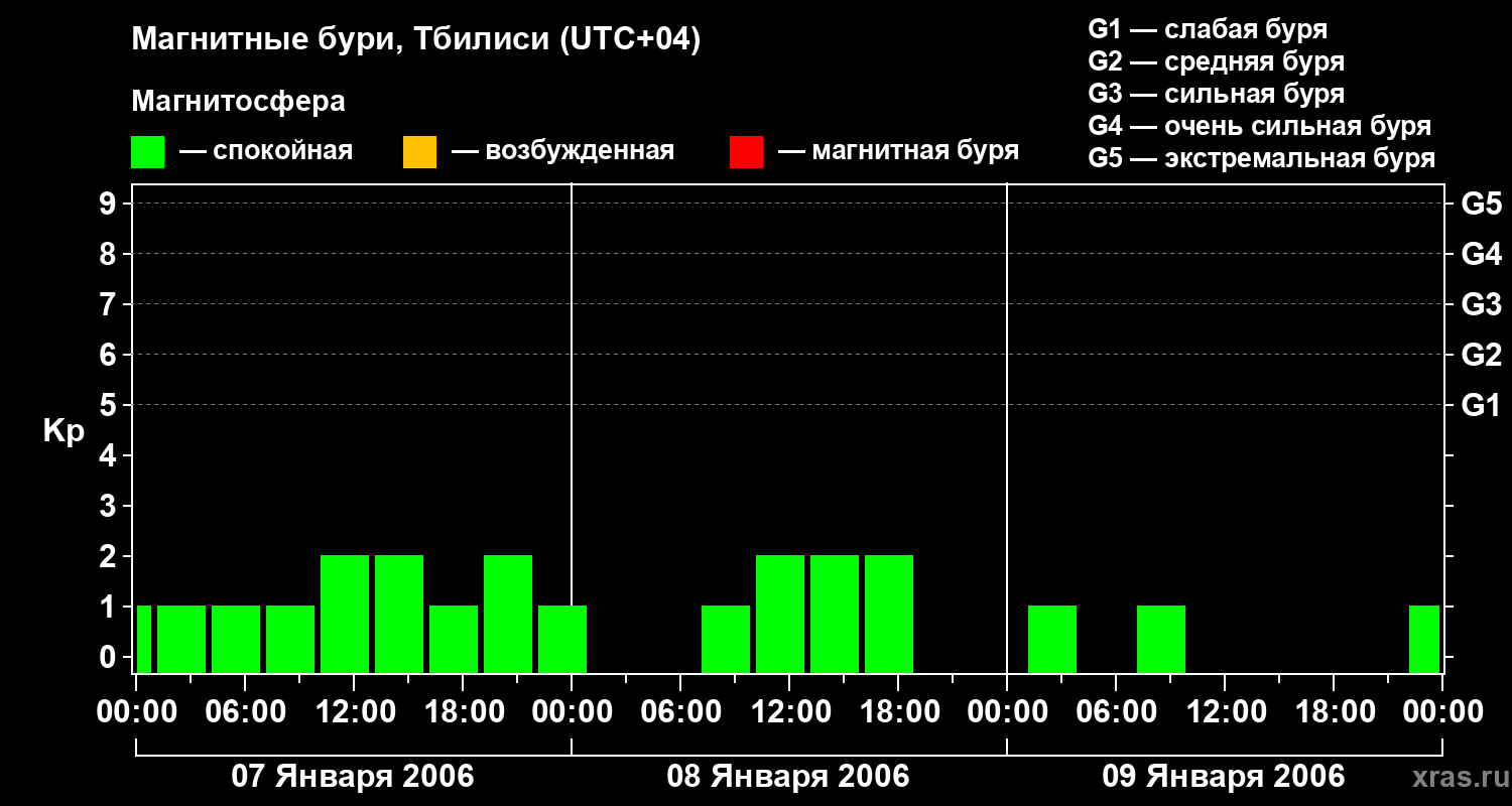 Изменения геомагнитного индекса Kp с 7 по 9 января 2006 года для средних широт